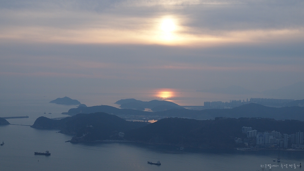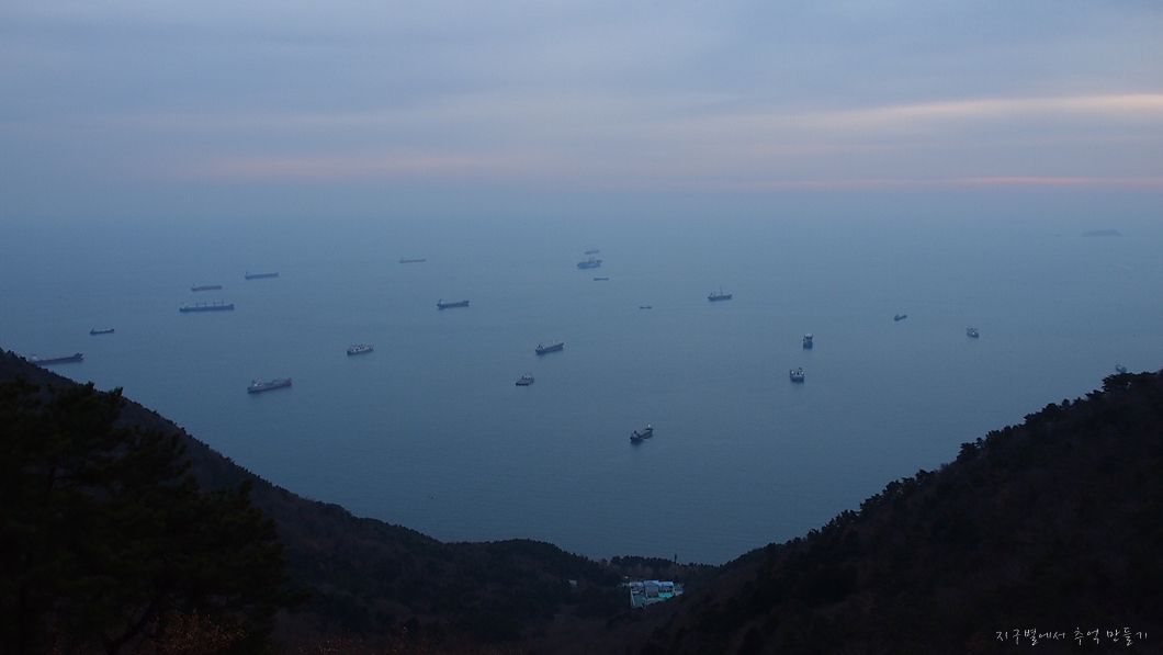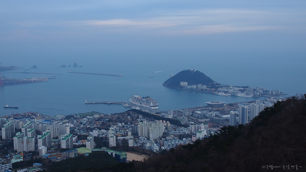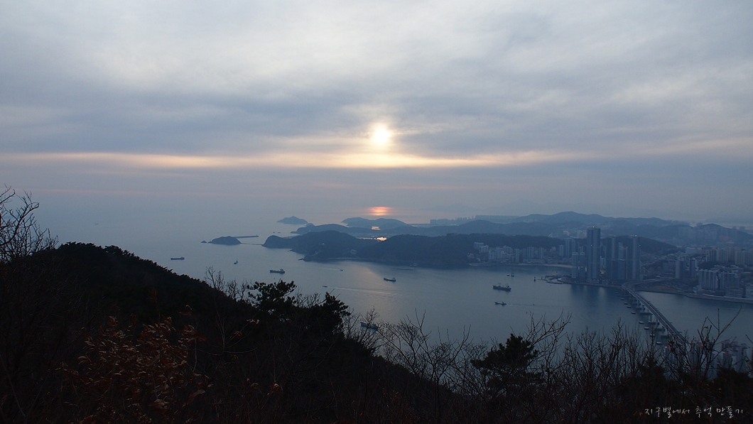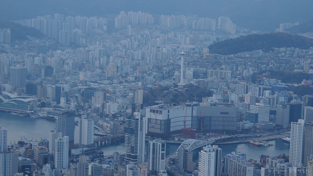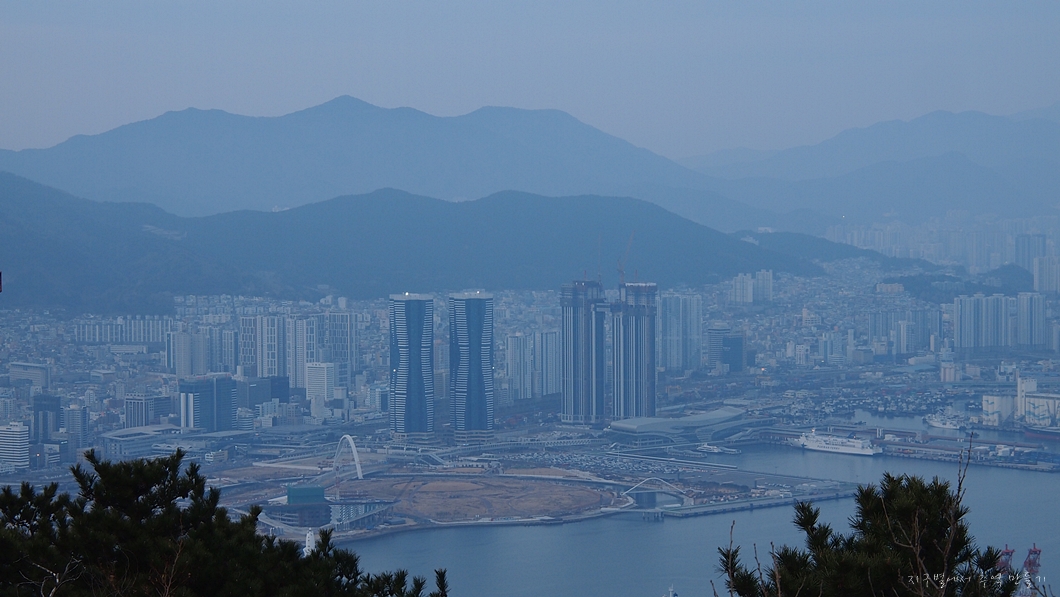 멀리 해운대는 미세먼지 속에 가물가물하고 좌측 중앙뒤로 얼마 전에 다녀온 장산이 솟아있습니다.