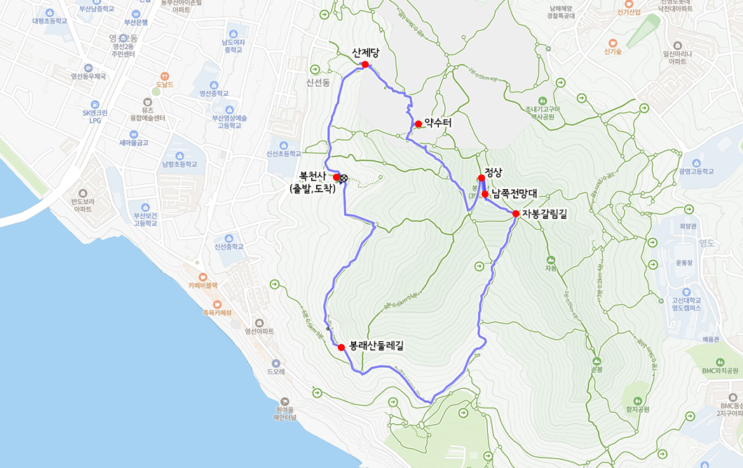 산행 코스 : 복천사 - 산제당 - 약수터 - 정상 - 자봉갈림길 - 둘레길 - 복천사(원점회귀)