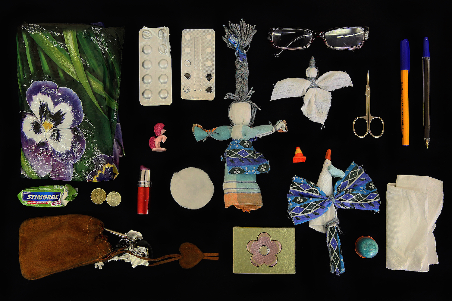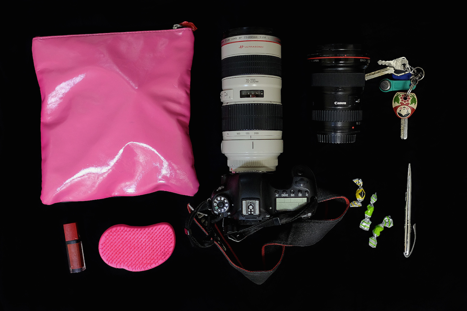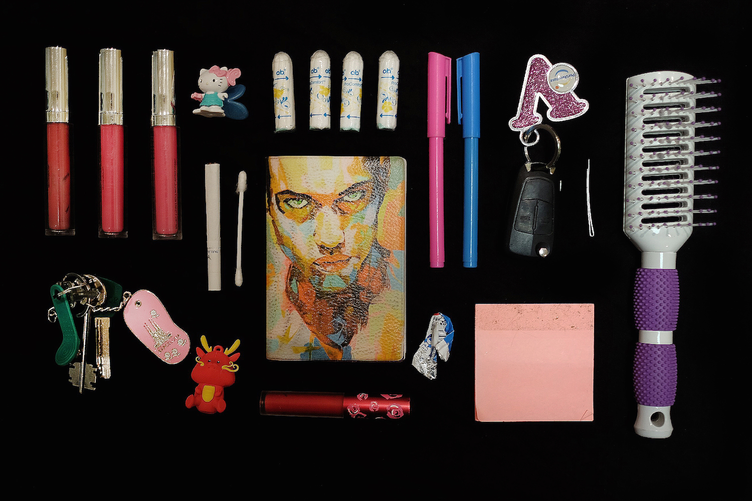 아래 사진들은 동의한 여성분들의 핸드백을 열어서 자신의 배낭에 넣어 다니는 검은색 천을 깔고 그것들을 정리하여 사진을 찍은 것입니다.