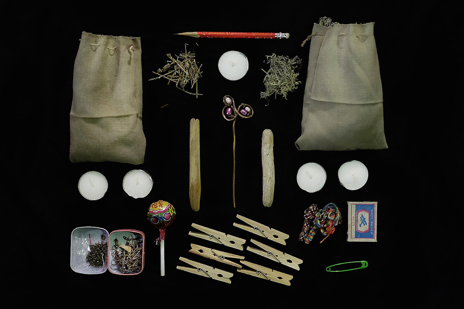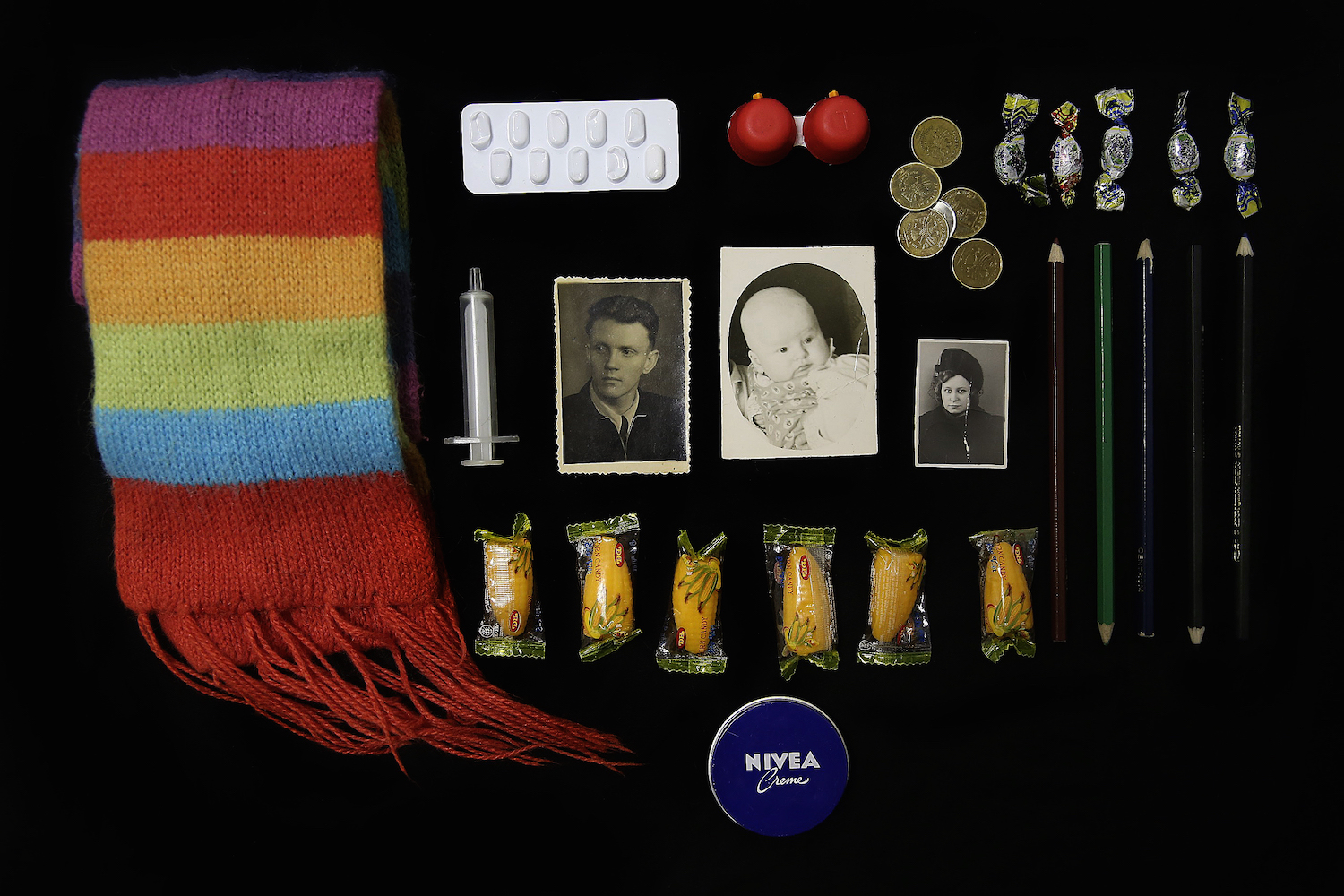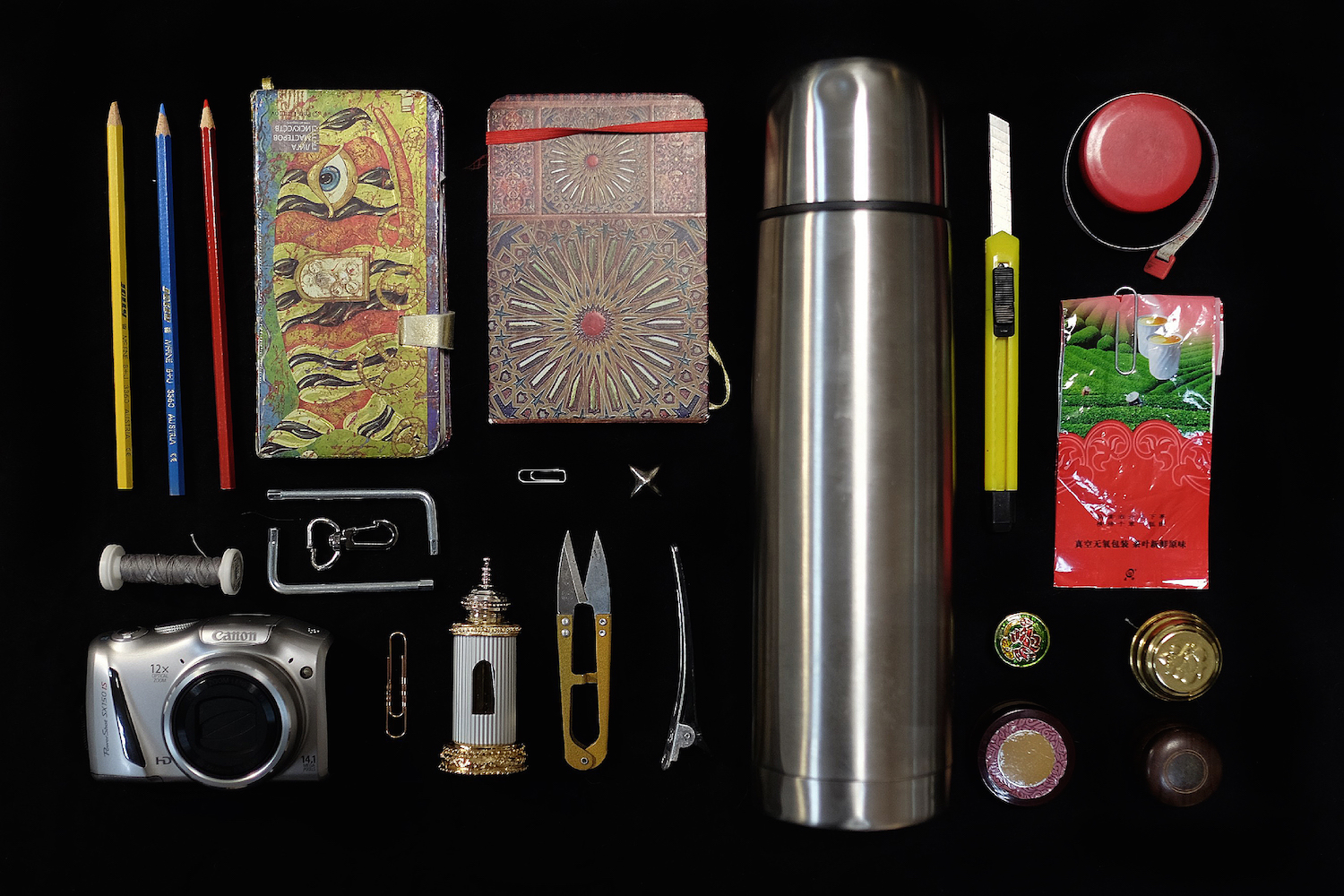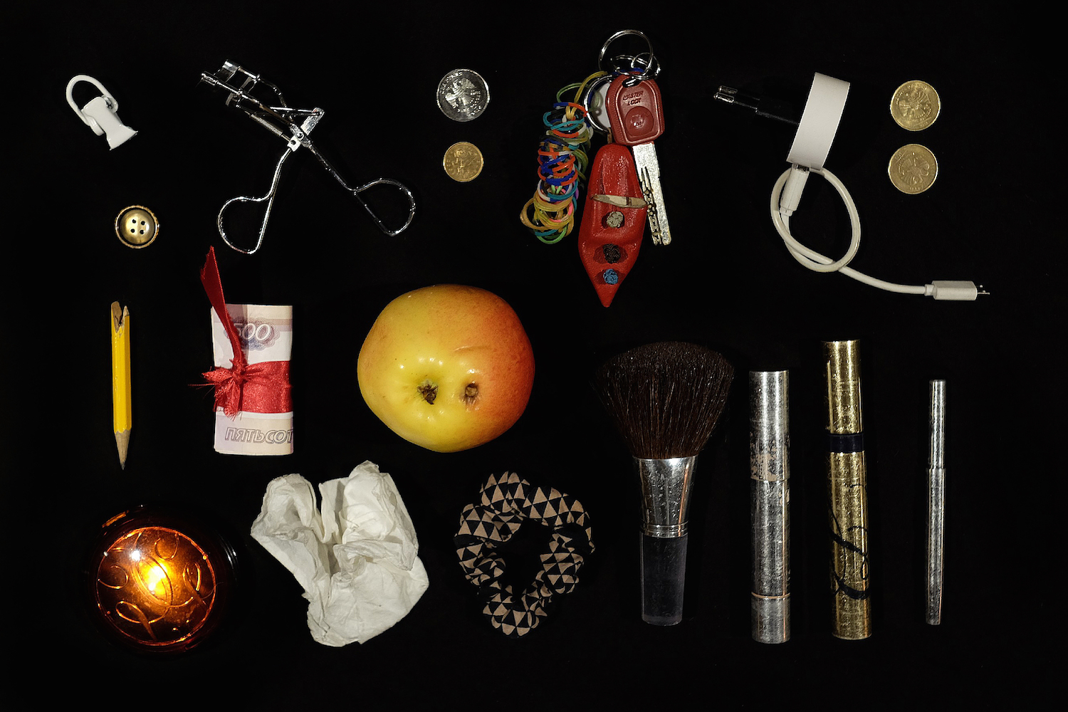 아래 사진들은 동의한 여성분들의 핸드백을 열어서 자신의 배낭에 넣어 다니는 검은색 천을 깔고 그것들을 정리하여 사진을 찍은 것입니다.