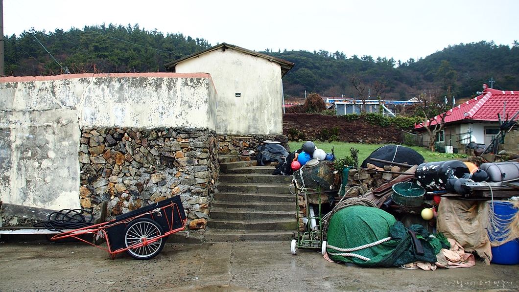 어구와 뭍의 용구들이 어우러져 있는 바닷가마을의 흔한 풍경.