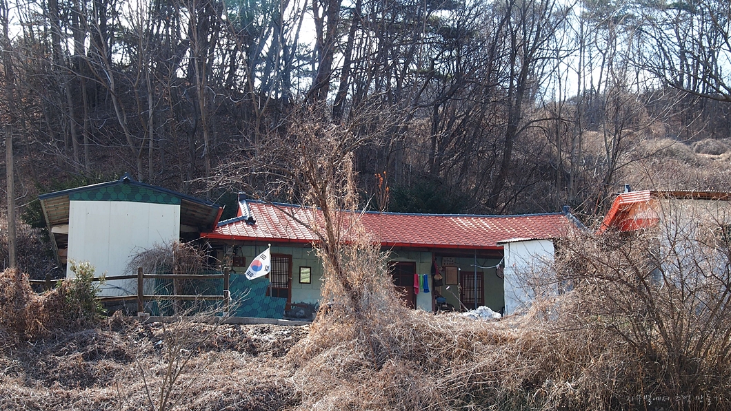 주차장 위에 홀로 있는 집에 걸려있는 태극기가 돋보입니다.