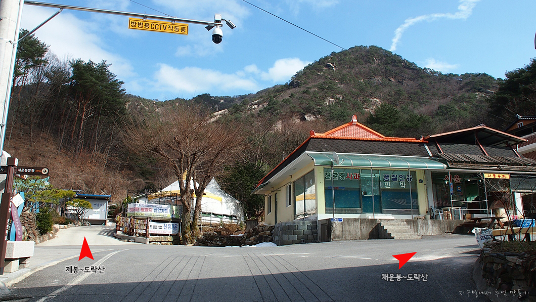 비탈진 포장도로를 잠시 오르면 동네 갈림길이 나오고 이곳에서 좌측이 제봉으로 오르는 길, 우측이 채운봉으로 오르는 길입니다.