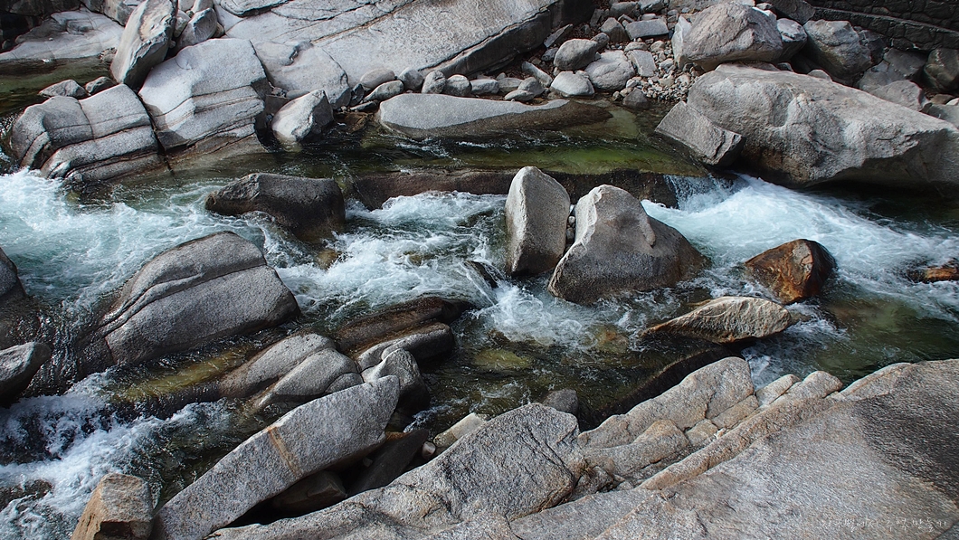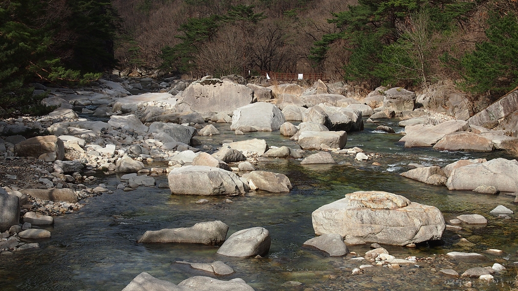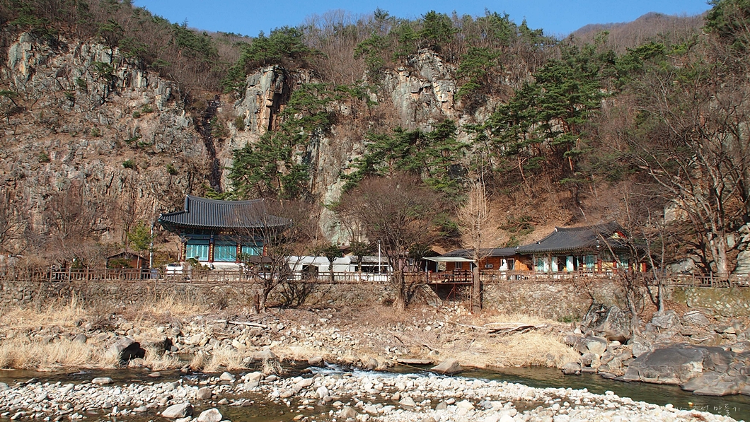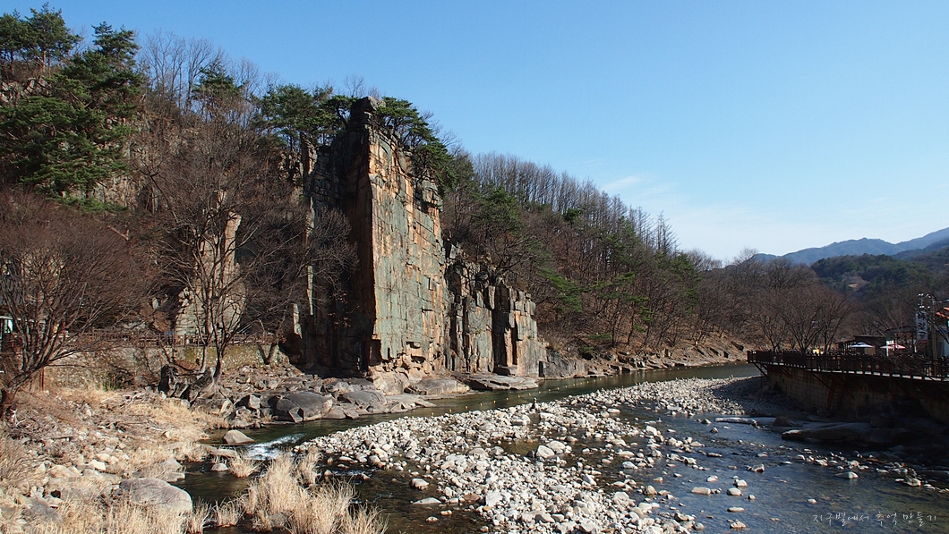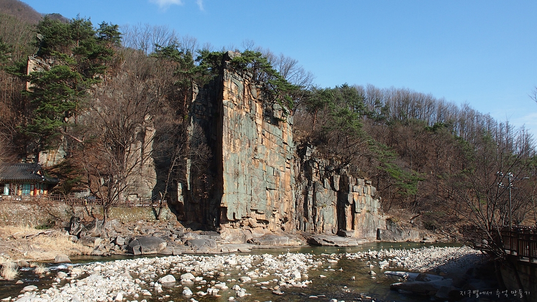 '깎아지른 암벽이 하늘에서 내려뜨린 병풍처럼 서 있고 그 아래로는 계곡의 맑은 물이 넓게 퍼져 흐른다. 높이 솟은 바위벽은 화강암의 절리가 발달하여 가로세로로 금이 가서 마치 큰 붓으로 죽죽 그은 산수화의 준법을 입체화시킨 듯하다.'