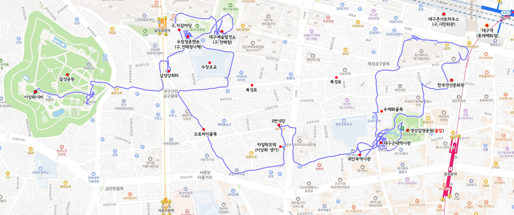 경상감영공원 - 대구근대역사관 - 수제화골목 - 한국전선문화관 - 대구역 - 북성로 - 희움일본군위안부역사관 - 이상화 생가 - 오토바이 골목 - 수창초교 - 수창청춘맨숀 - 대구예술발전소 - 삼성상회터 - 달성공원