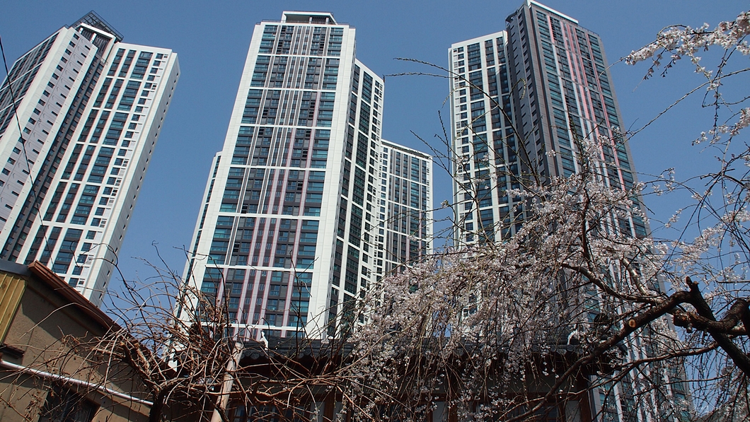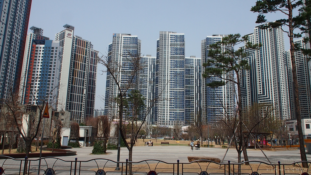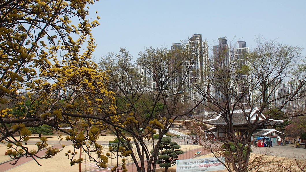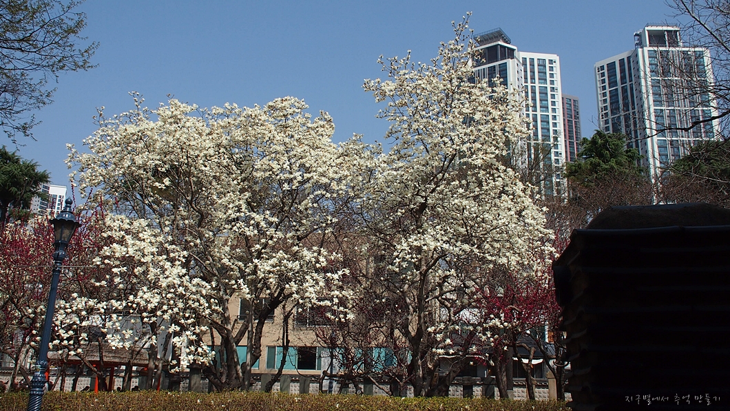 매화 만발한 근대식 이층 집을 배경으로 펼쳐진 고층빌딩들을 보면서..