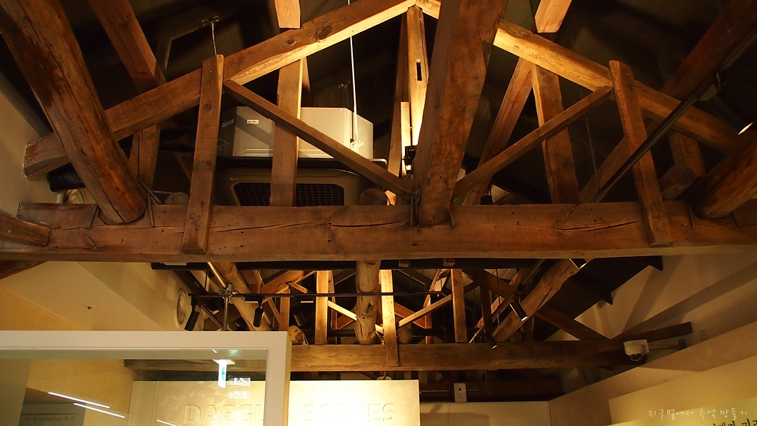 입구로 들어가면 위 천정에 이전의 건물 모습이 보이게 해 두었습니다.
