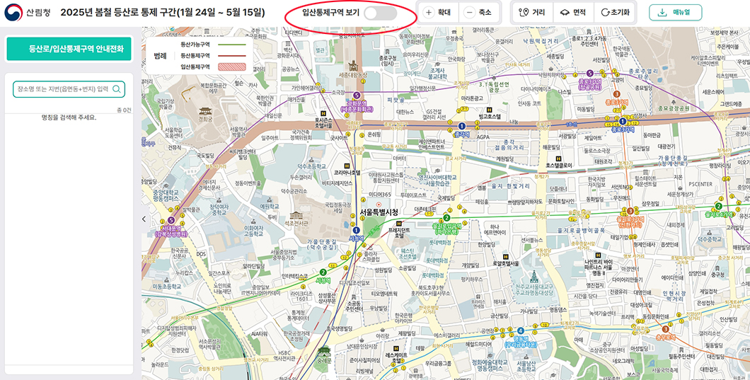 상단의 입산통제구역보기를 우측 ON으로 하면 지도에 주황색으로 구역이 설정이 되어 나타나는데 이곳이 입산금지구역입니다.