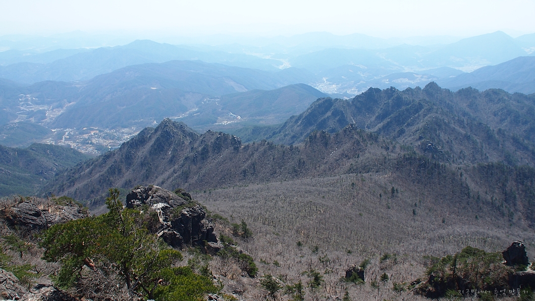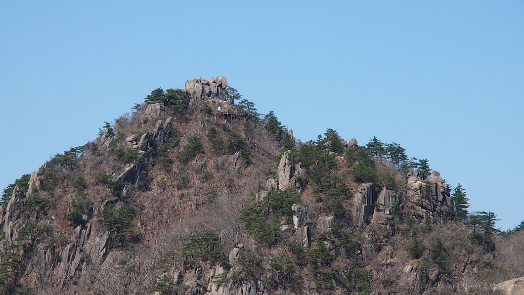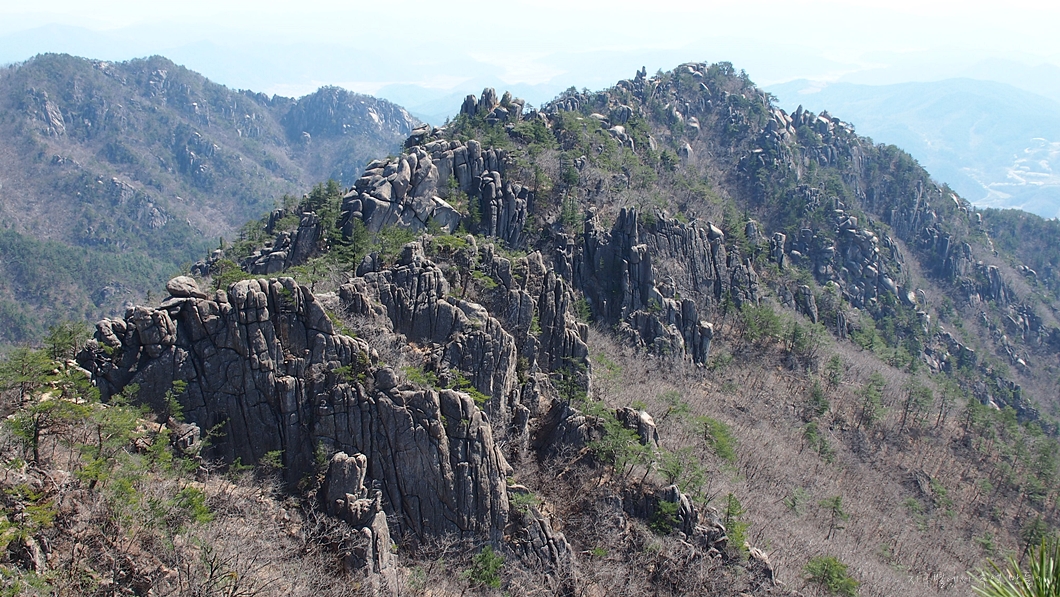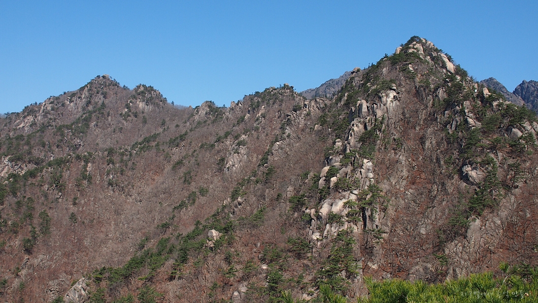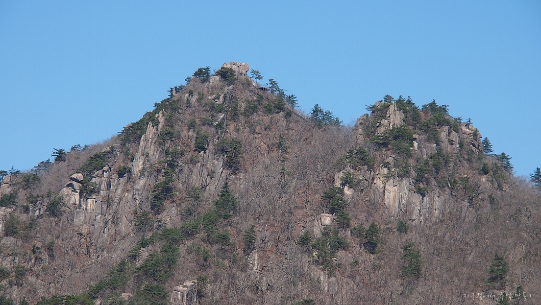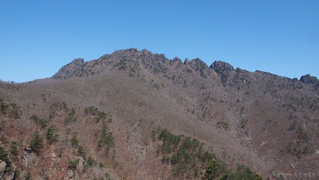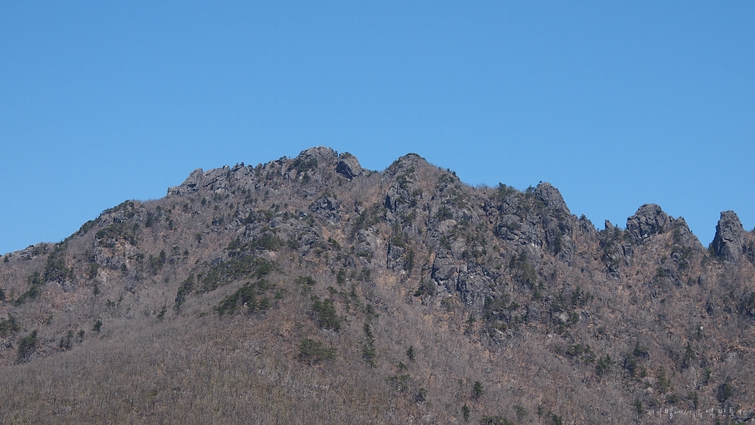 상단 능선에서 좌측으로 멧돼지 주뎅이처럼 생긴 바위봉은 봉천대라고 하는데 바로 그 위가 상왕봉이고 이곳에서는 보이지 않습니다.