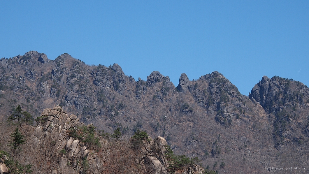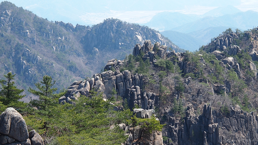 수많은 바위 사이로 난 능선길을 따라 계속 오르면 만물상의 끝인 상아덤에 도착하고 이곳에서 뒤돌아 본 풍경입니다.