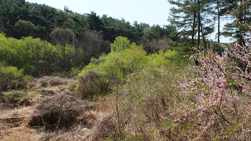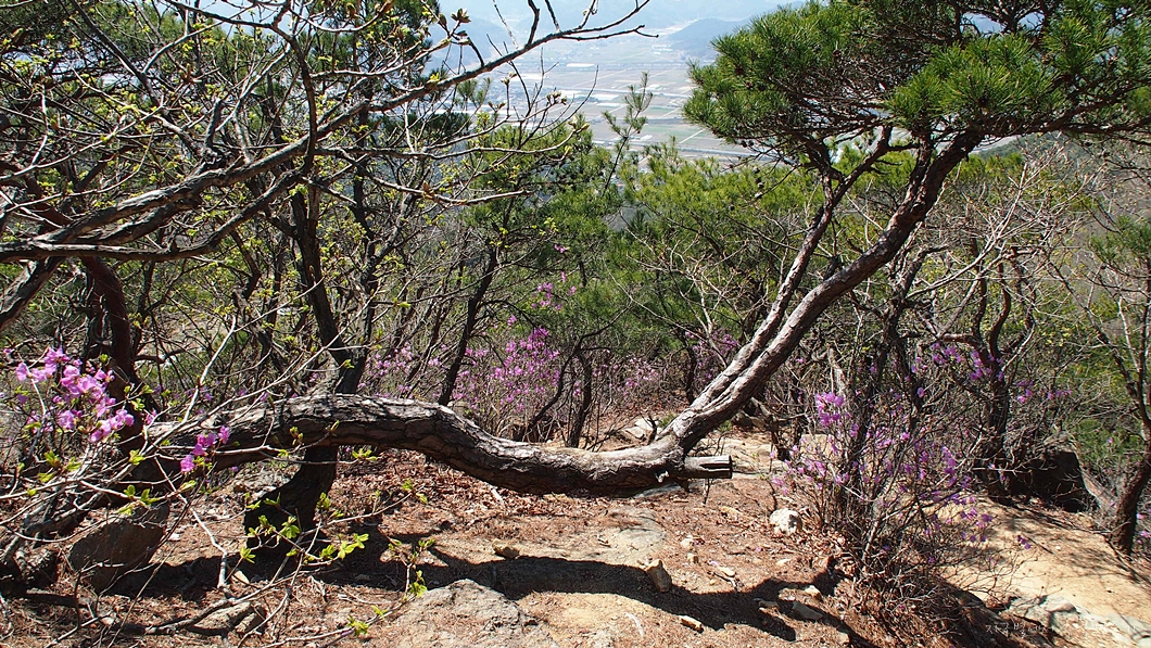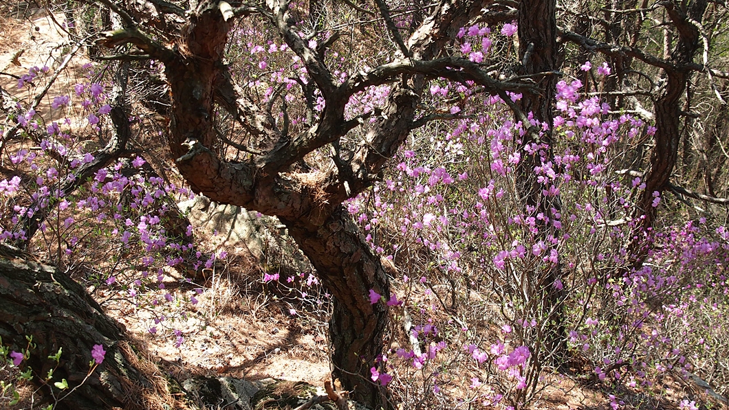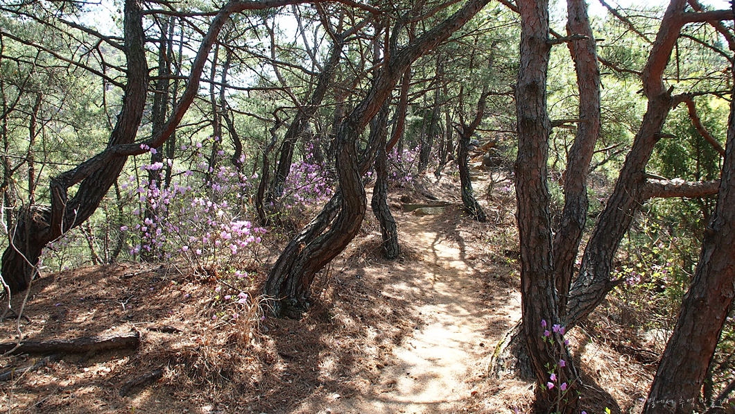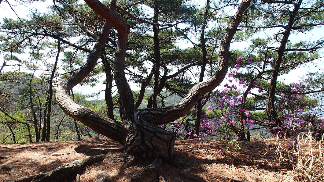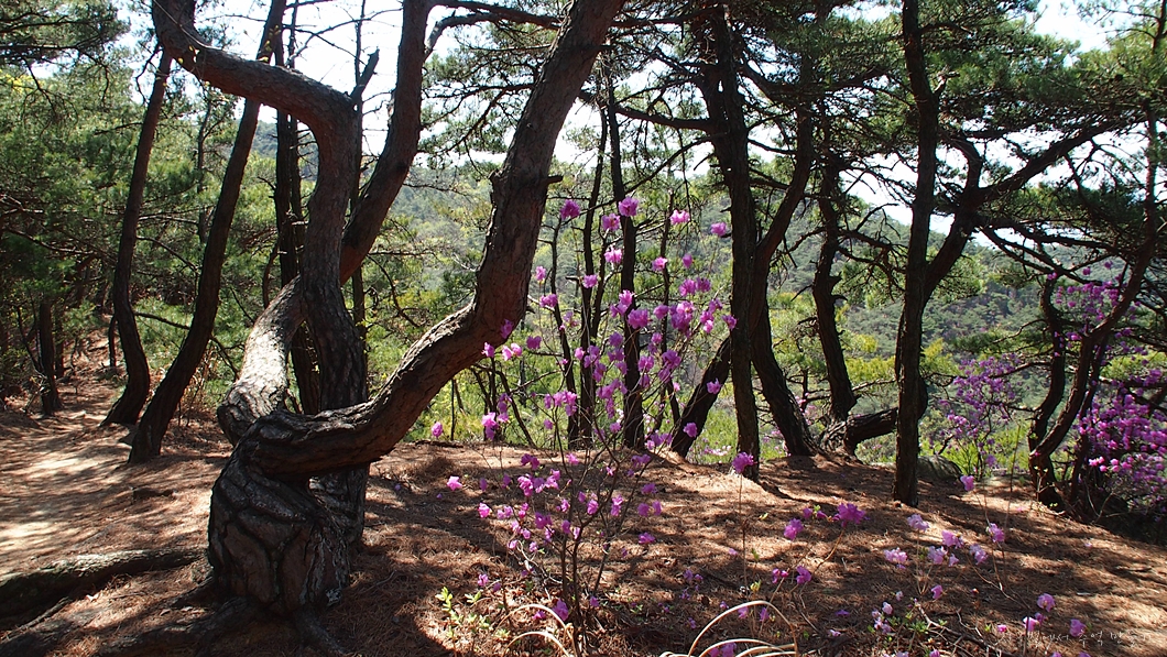 아주 특이하게 생긴 소나무가 있는데 그 앞에 진달래가 만발하여 더욱 새로운 풍경을 연출합니다.