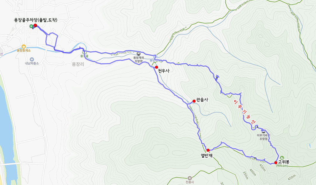 산행 코스 : 용장골주차장 - 이무기능선 - 고위봉 - 열반재 - 관음사 - 천우사 - 주차장(원점회귀)