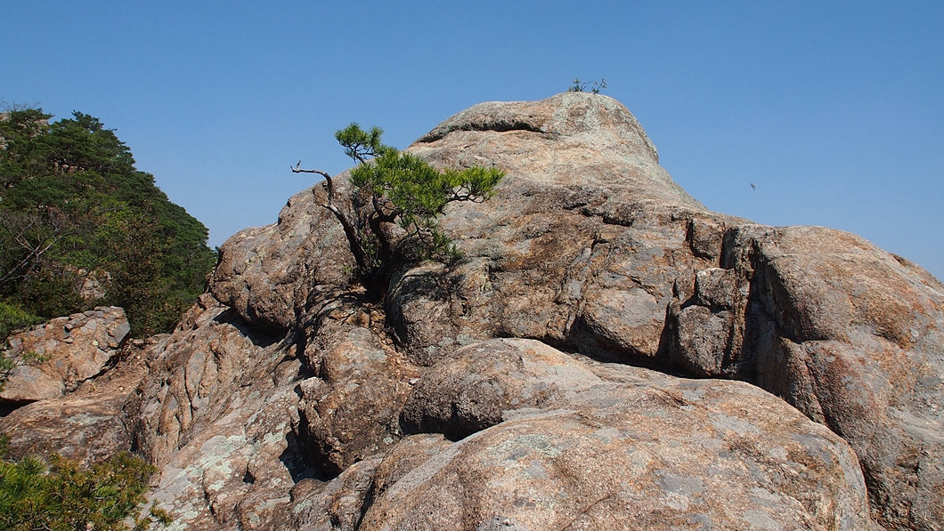 바위 맨 위에서 자라는 나무가 있는데 소나무는 아닙니다.