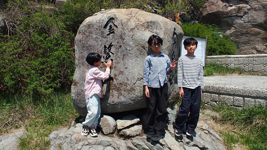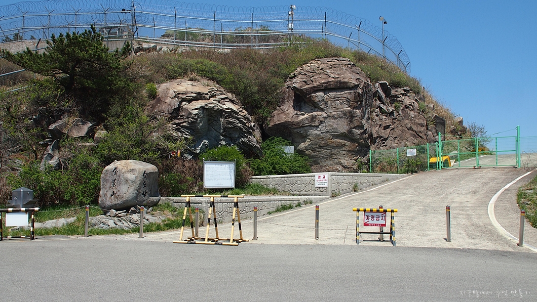 정상에는 군사시설이 있어 올라가지 못하고 그 아래 정상석이 만들어져 있답니다.