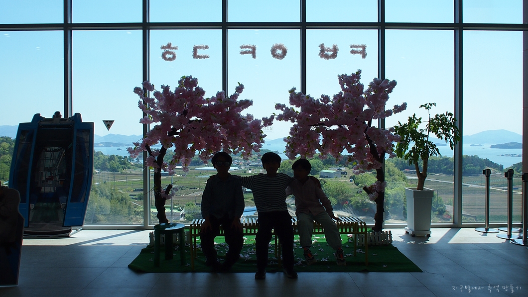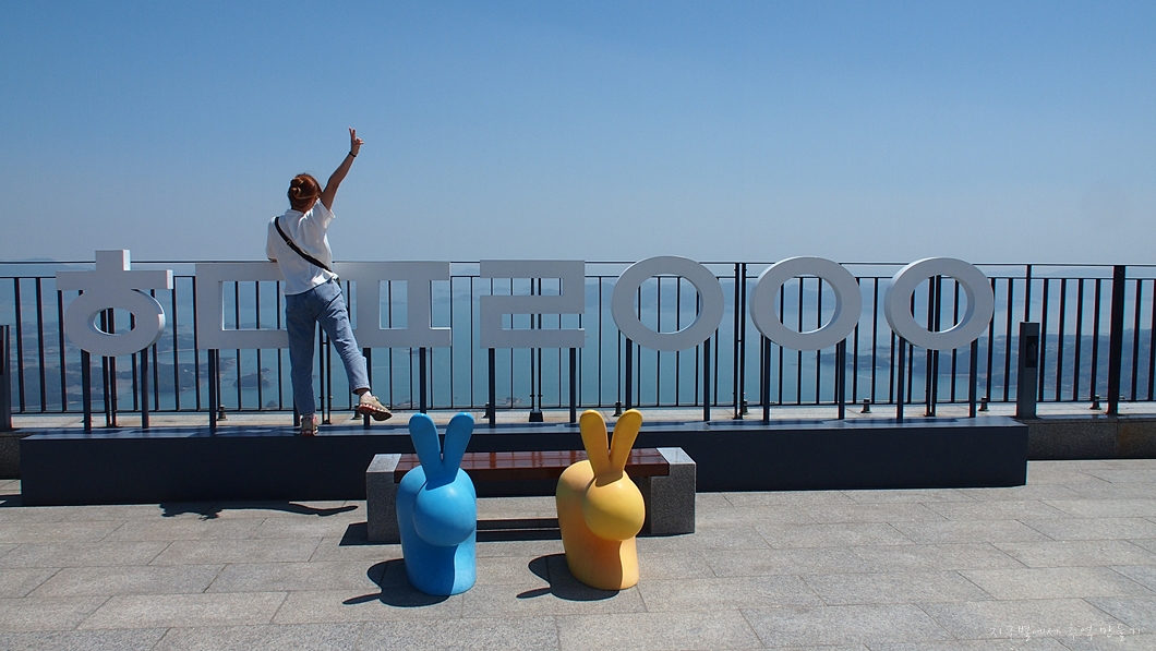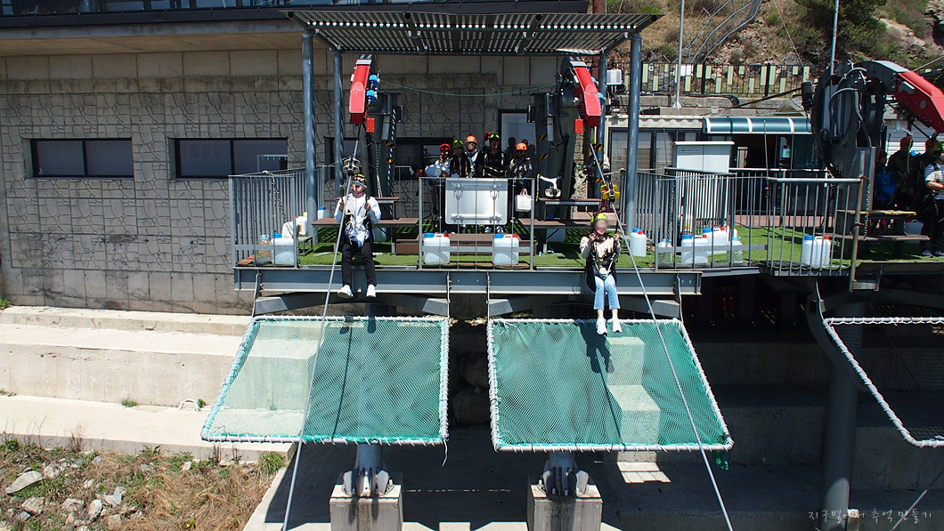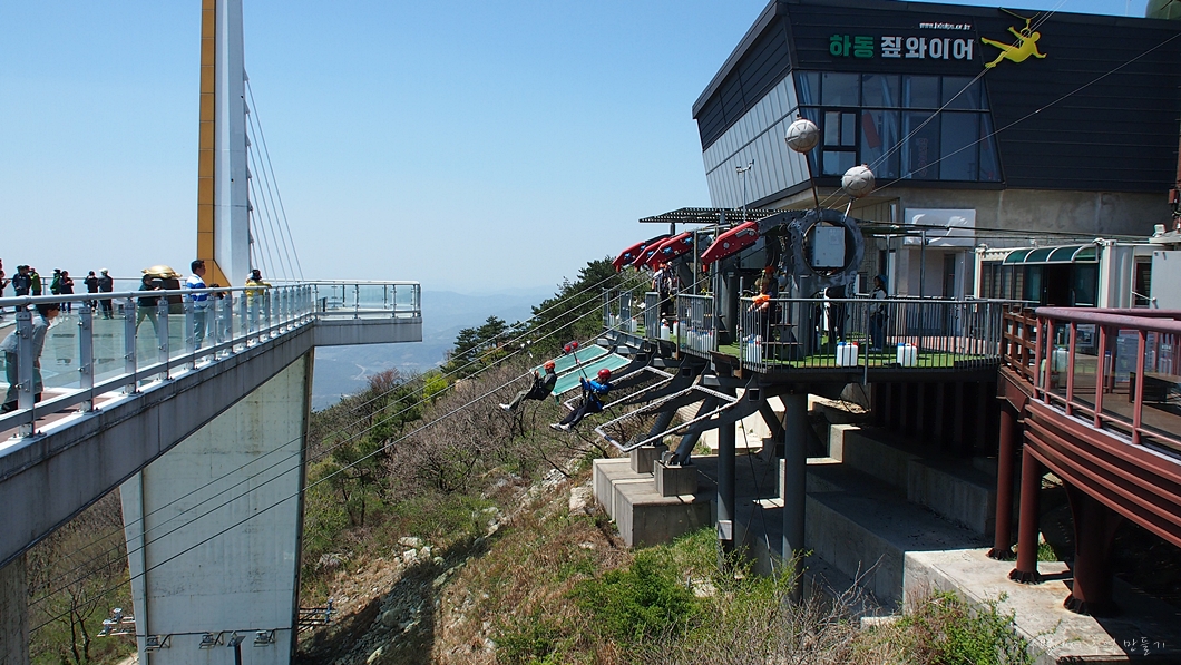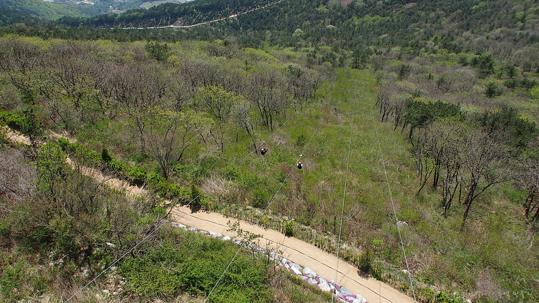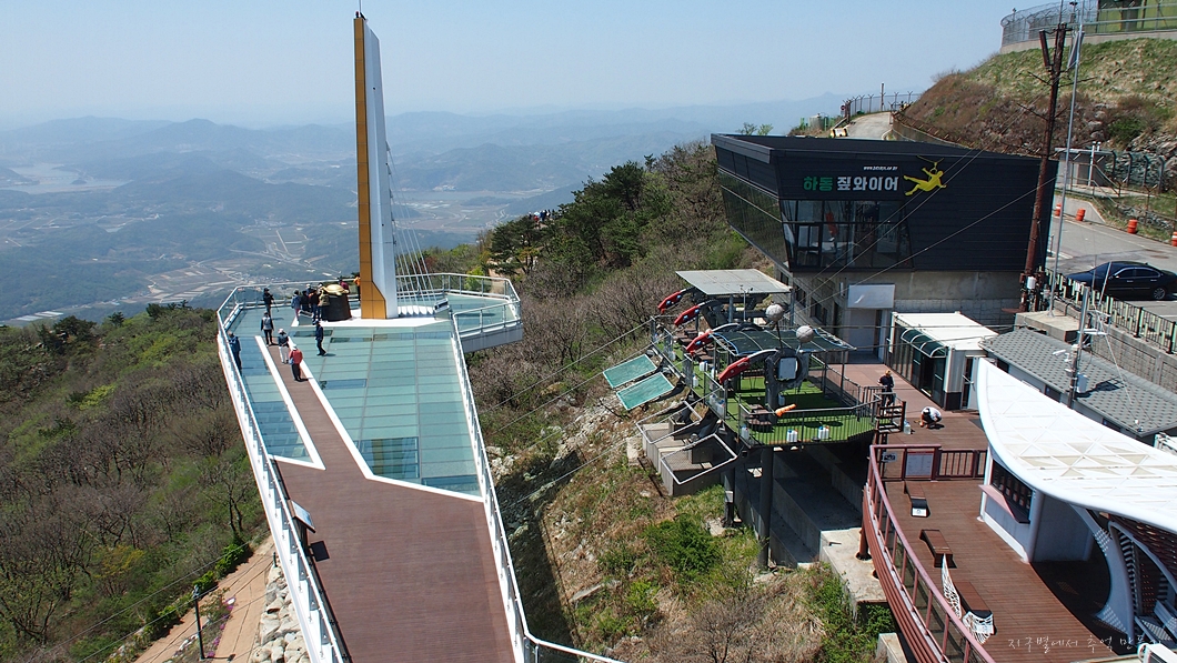 아래 보이는 건물은 짚라인의 중간 정류장이고 그 아래로 남해섬이 조망됩니다.