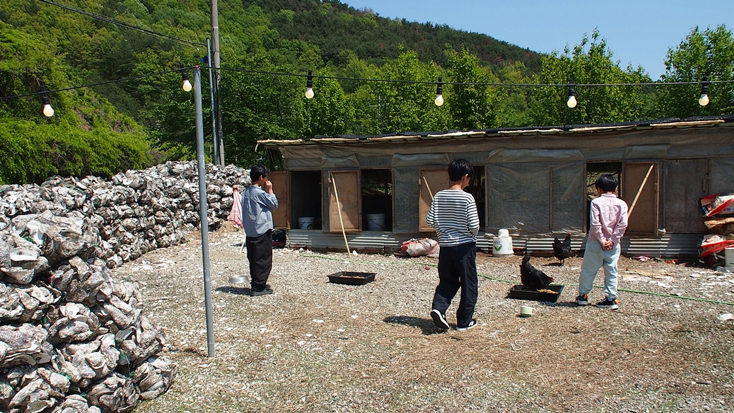 한 옆에는 소비된 벚굴로 담장을 만들어놓고 닭을 놓아기르고 있네요.