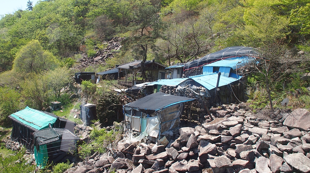 정상 아래에서 내려다보이는 석굴암이란 암자인데 관리를 하지 않는지 거의 폐가처럼 보입니다.