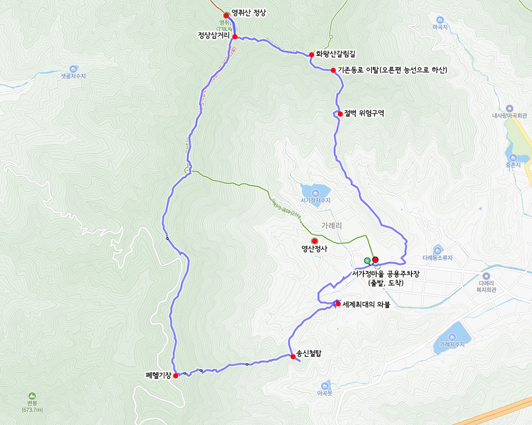 산행 코스 : 서가정마을 주차장 - 와불 - 능선 송전탑 - 폐헬기장 - 능선길 - 정상 - 하산하면서 우측 능선으로 - 주차장(원점회귀)