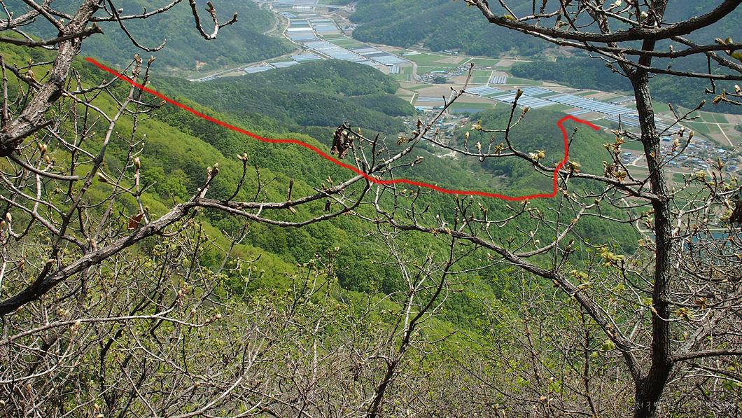그래서 일단 우측으로 보이는 능선을 따라 내려가보기로 합니다.(빨간 선)