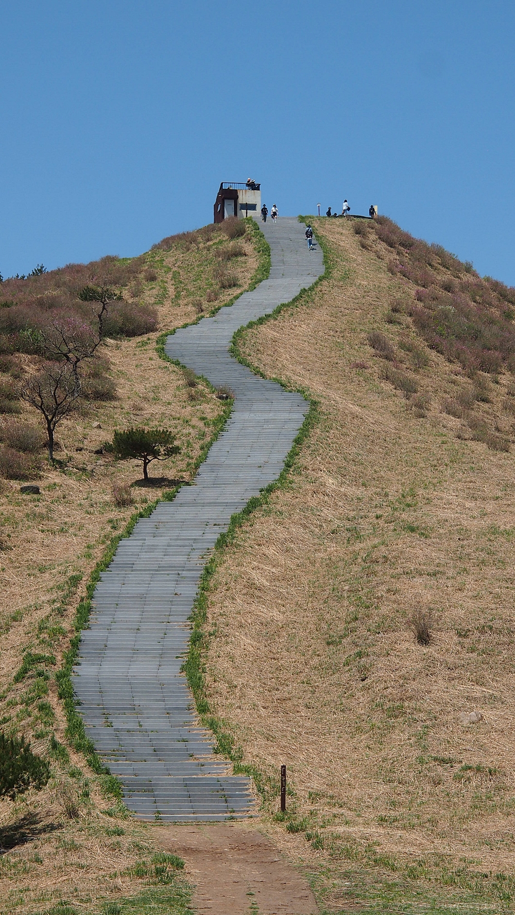일몰 명소인 황매정각이 보이고 황매산으로 오르는 550 계단이 정상으로 이어지고 있습니다.