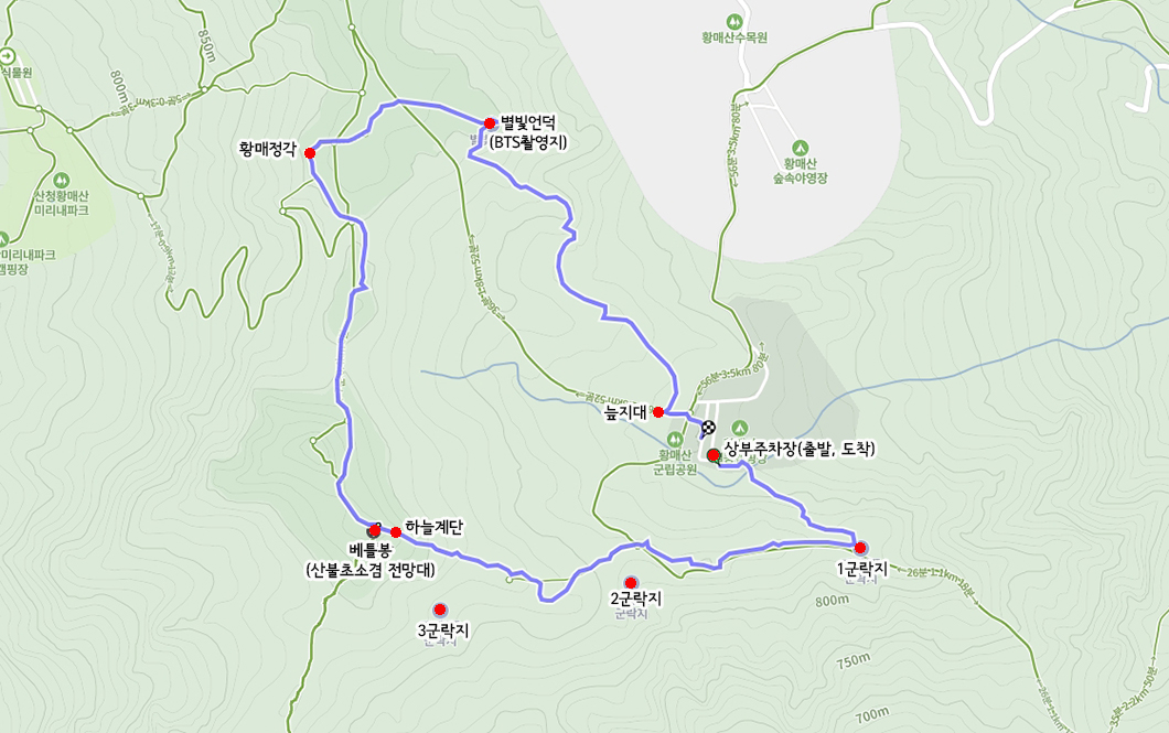 산행 코스 : 상부 주차장 - 철쭉군락지 1,2,3 - 하늘계단 - 베틀봉 - 황매정각 - 별빛언덕(BTS뮤비촬영지) - 주차장(원점회귀)