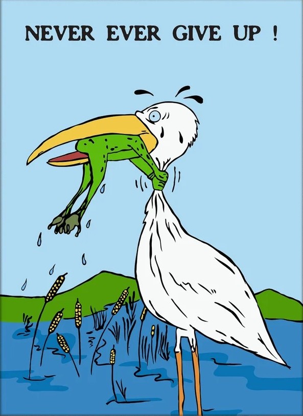 하여튼 그날 이후, 황새에게 머리부터 잡혀먹게 된 개구리가 황새의 목을 조르고 있는 이 한 컷짜리 유머러스한 그림은 내 책상 앞에 항상 자리 잡고 있다.