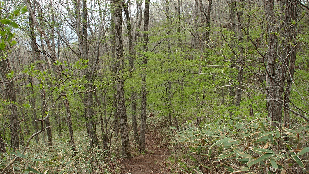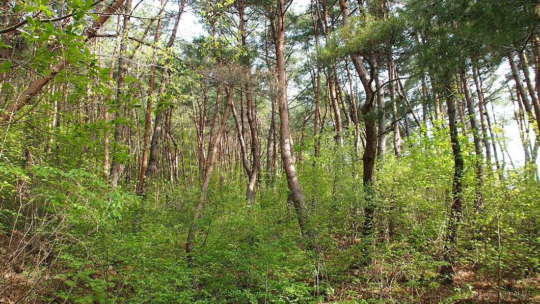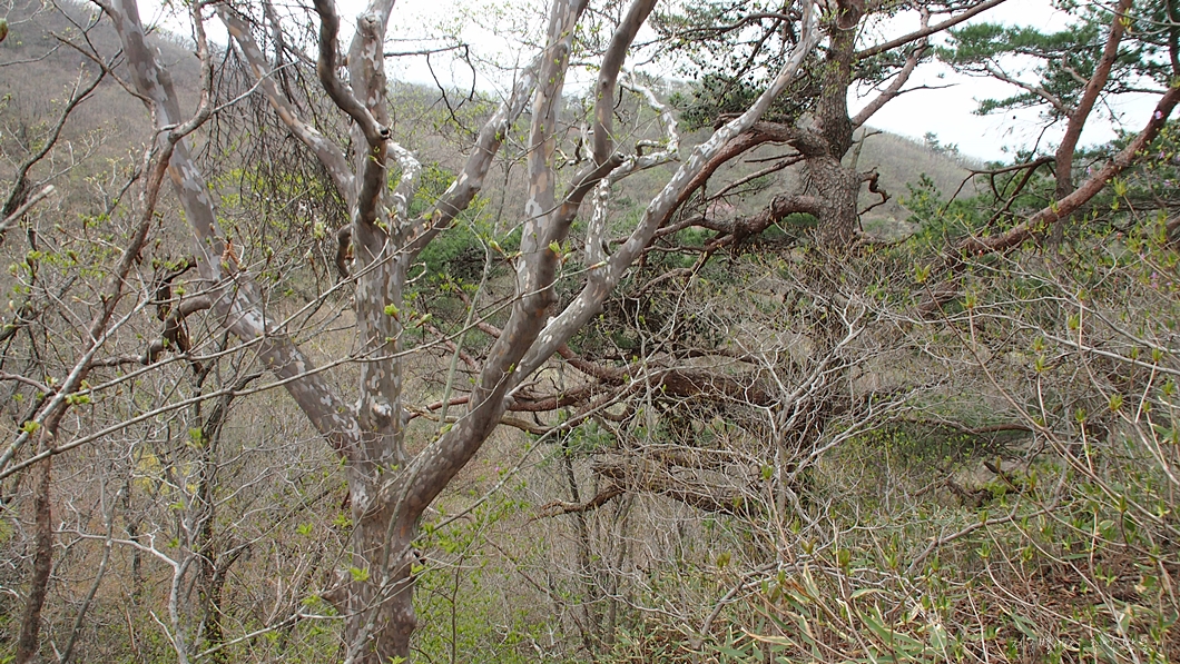 산 정상 아래에는 산죽 위로 솟아있는 나무들이 이제 막 연두잎을 돋아내고 있는데..