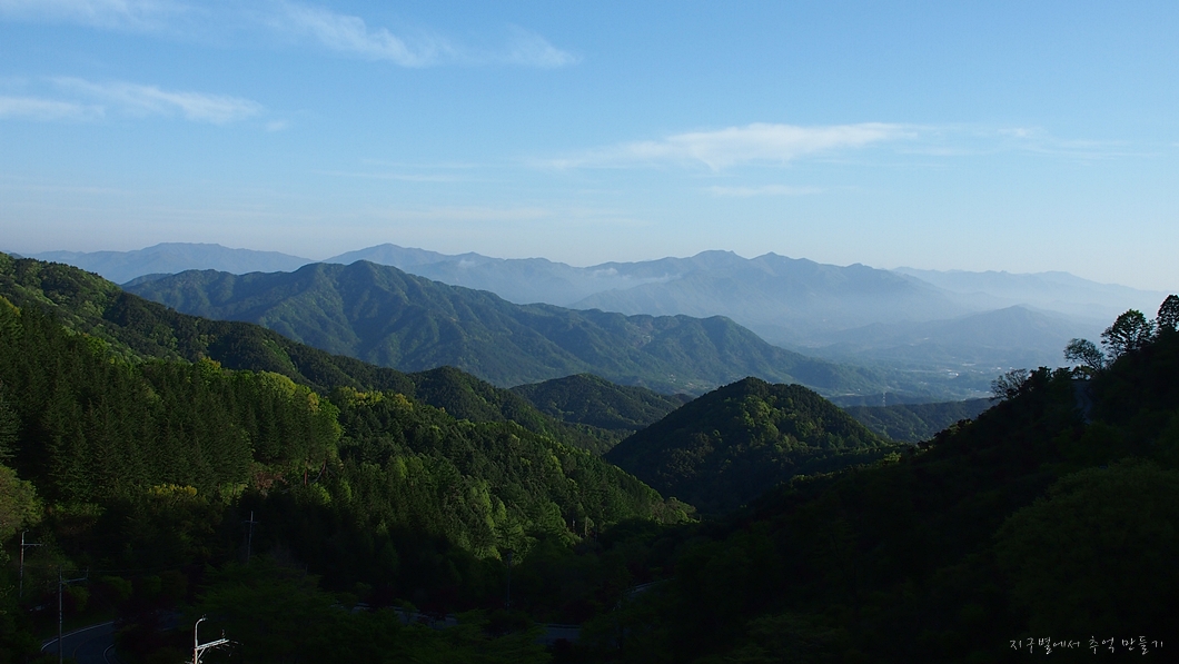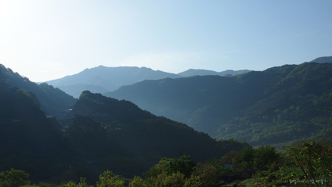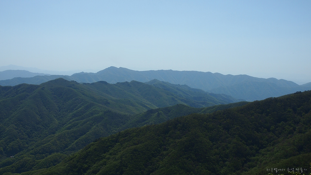아래쪽은 녹색으로 변해져 있고 산 위는 아직 잿빛인데 그게 연두로 변하면서 얼마 뒤에는 모두 녹색이 되구요.