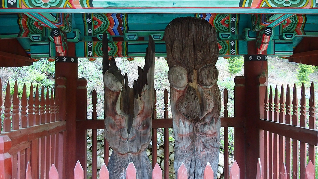 원래는 사찰입구에 세워져 있었는데 1969년 발생한 산불로 인하여 왼편의 금호장군 머리가 타 버렸답니다.