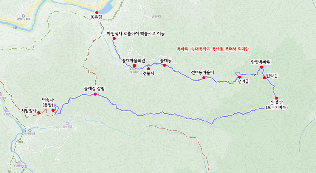 벽송사 주차장 - 벽송능선 - 와불산(오뚜기바위) - 안락문 - 함양독바위 - 선녀굴 - 송대동 - 견불사 - 도로를 따라 걸어내려가다가 택시 타고 벽송사로 가서 차량 회수