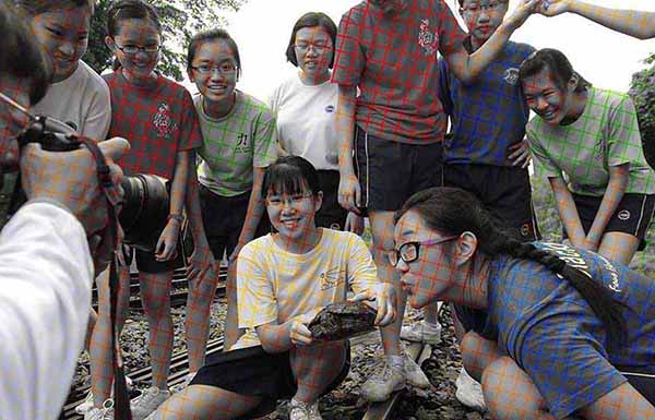 이 사진은 흑백 사진에 얇은 컬러 격자선이 겹쳐서 그려져 있는데 우리 뇌가 빠진 색을 채우도록 속이는 것입니다.