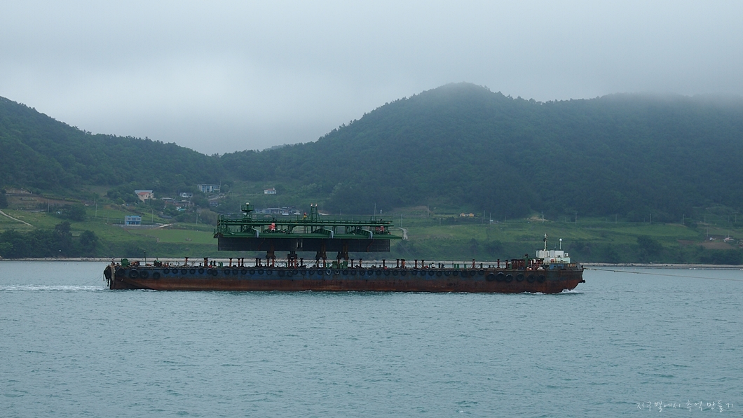 바지선에다 별 희한한 장치를 싣고 가고 있네요.