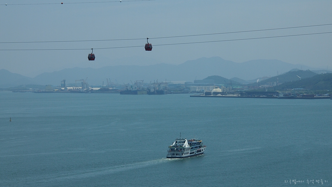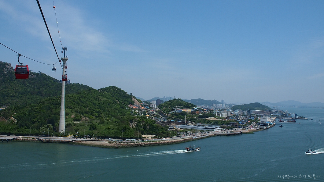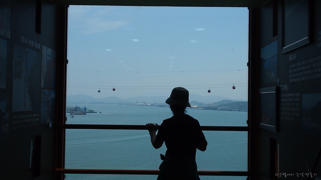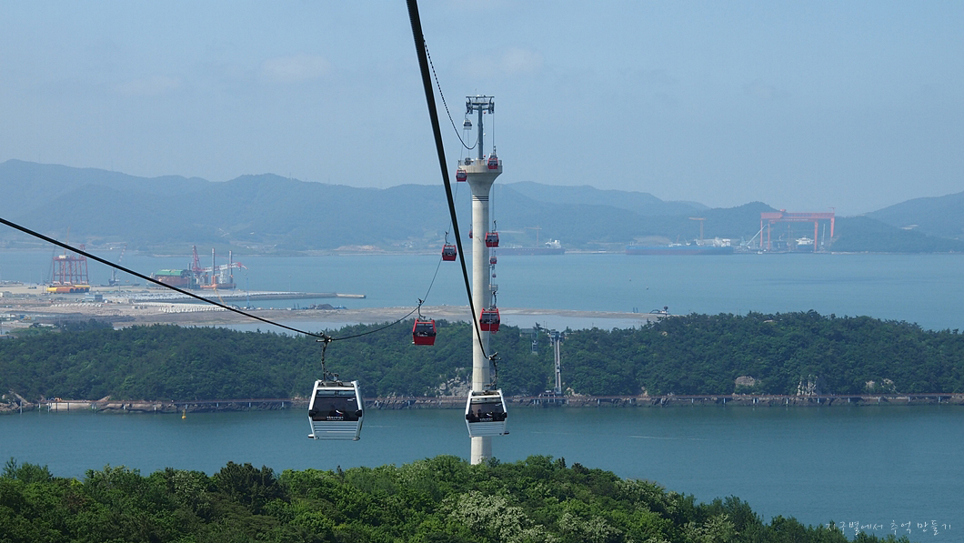 곧 타야 할 케이블카가 바다 위를 지나가고 있네요.