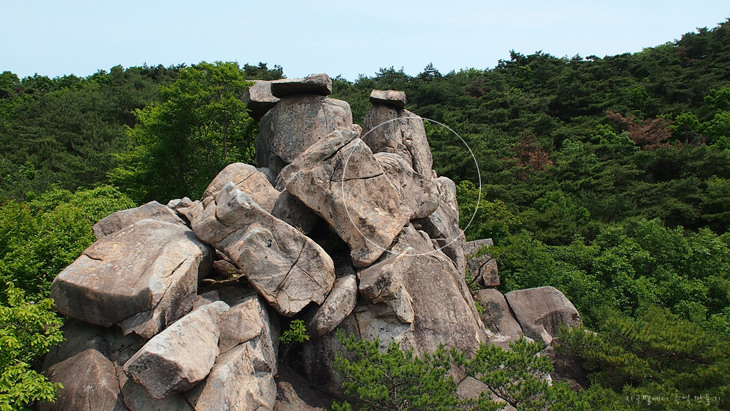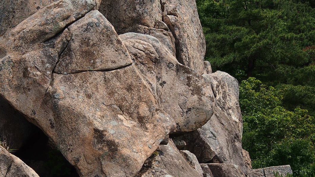 기댄 바위 가운데 머리를 넣고 찍으믄 작품이 되겠지유.