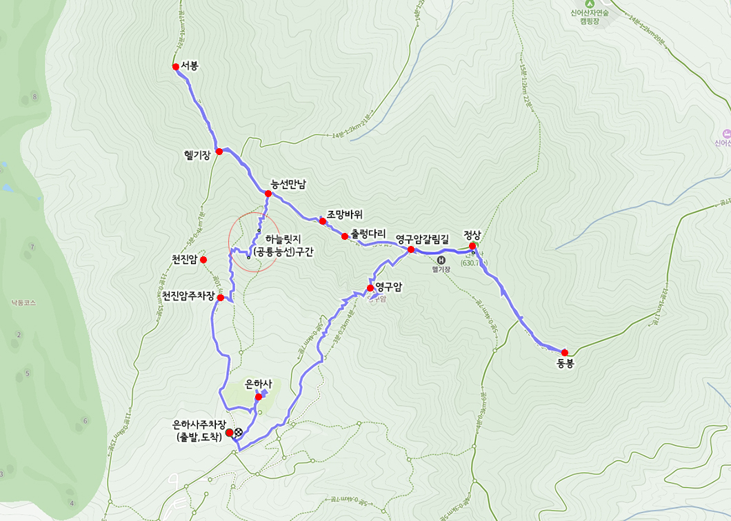 산행 코스 : 은하사주차장 - 하늘릿지 - 서봉왕복 - 정상 - 동봉왕복 - 영구암 - 은하사(원점회귀)