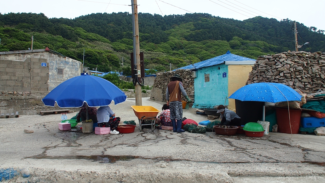 마을 분들이 홍합을 까는 작업을 하고 있네요.