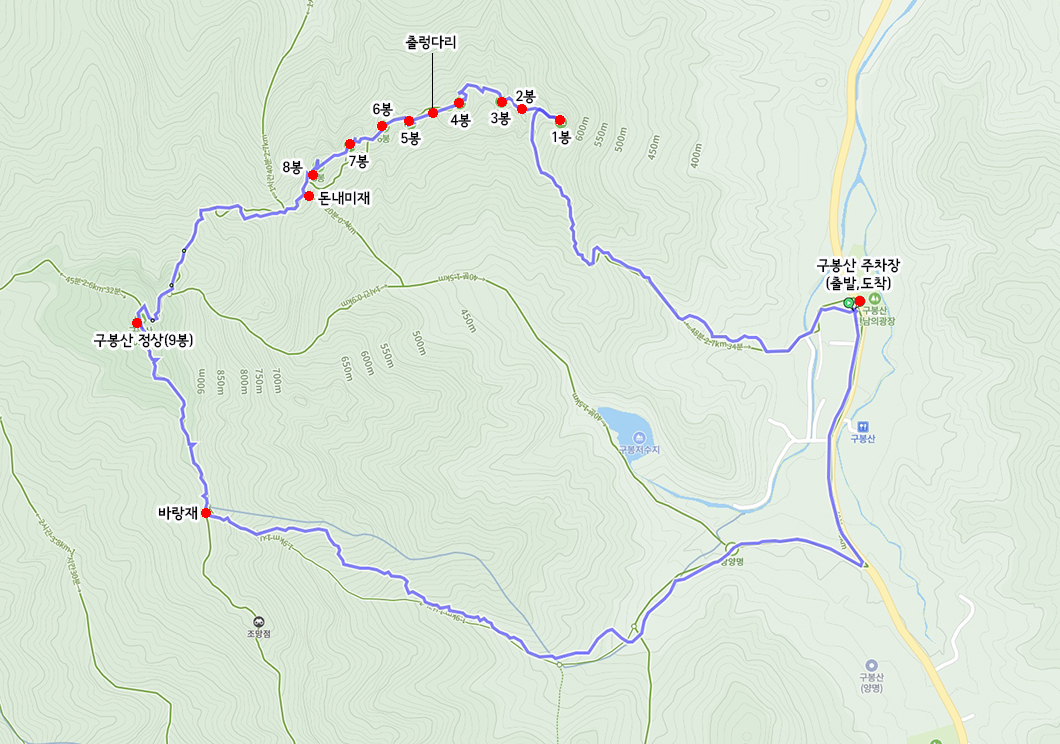 산행 코스 : 구봉산 주차장 - 1봉~8봉 - 돈내미재 - 9봉(정상) - 바랑재 - 주차장(원점회귀)