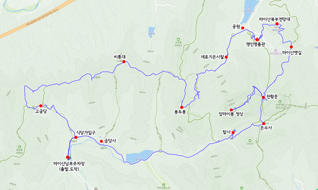 남부주차장 - 고금당 - 비룡대 - 봉두봉 - 북부사양저수지 - 명인명품관 - 북부전망대 - 천황문 - 암마이봉 정상 - 되돌아내려 와서 - 은수사 - 탑사 - 남부주차장(원점회귀)