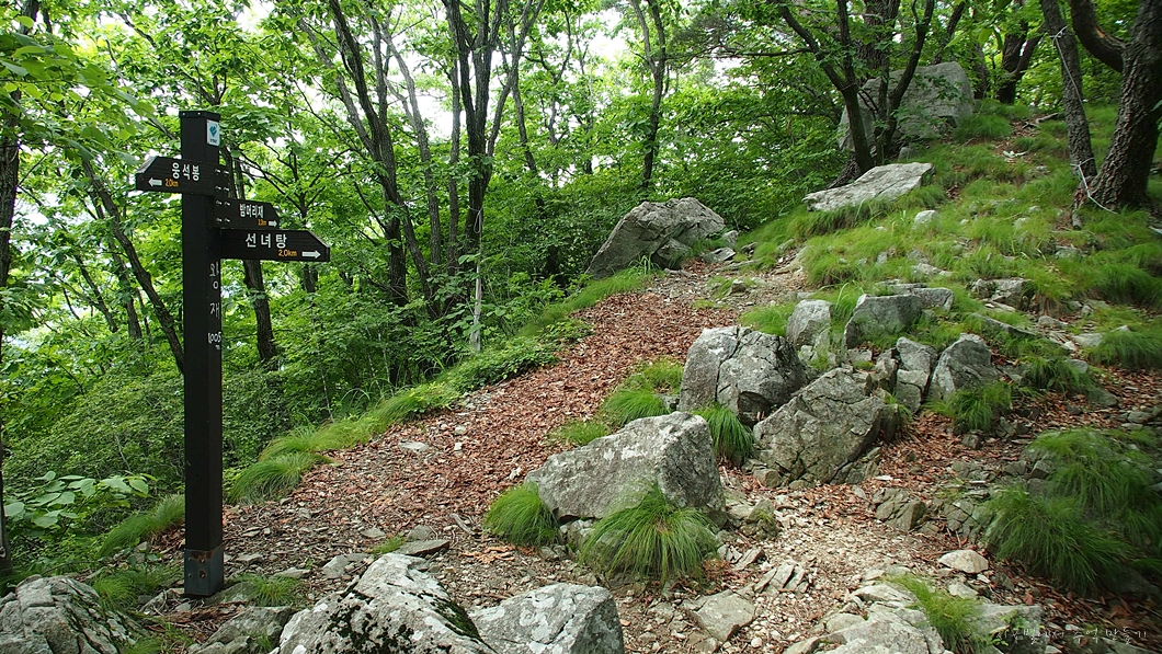 십자봉을 거쳐 정상으로 오르는 길은 흙길이 많은 육산이고 선녀탕 계곡으로 오르는 길은 거의 너덜길입니다.