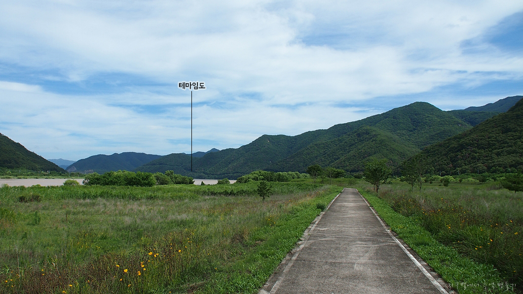 멀리 산 아래 길게 이어진 테마임도가 보입니다.