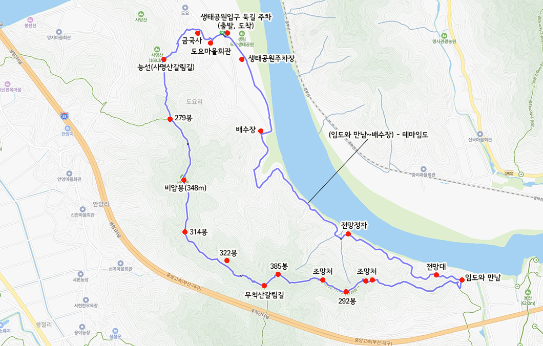 비암봉에서 무척산으로 이어지는 지맥구간 코스도 괜찮을 것 같지만 오늘은 낙동강 물구경이 우선이니 비암봉 아래 근간에 조성이 된 테마임도길을 걷기로 하고 산행은 도요마을에서 출발하는 원점회귀코스를 택했습니다.