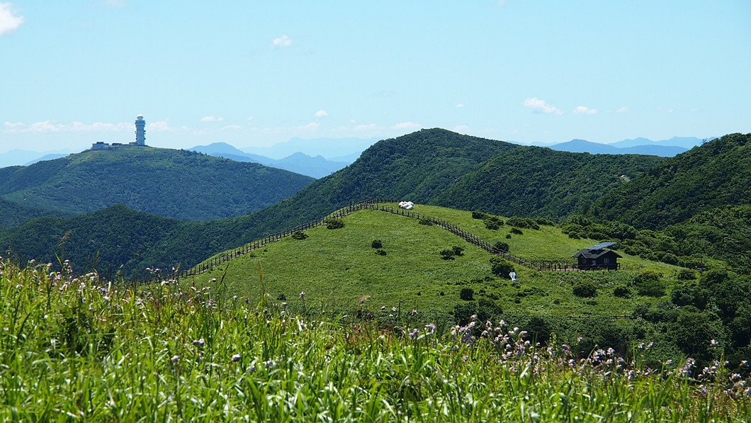비비추가 가득 피어있는 언덕과 멀리 바라다보이는 국망봉.