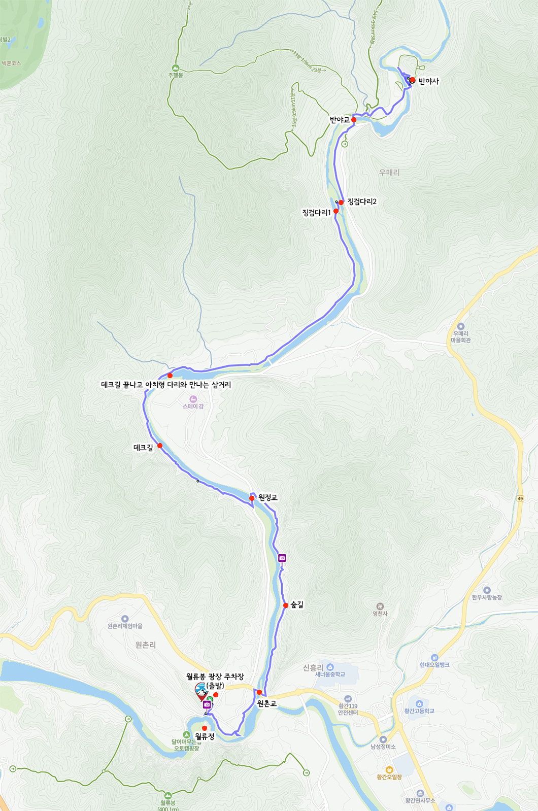 한천 8경 중 1 경인 월류봉에서 시작하여 반야사에서 끝나는 가벼운 트레킹 코스입니다.