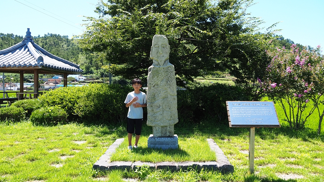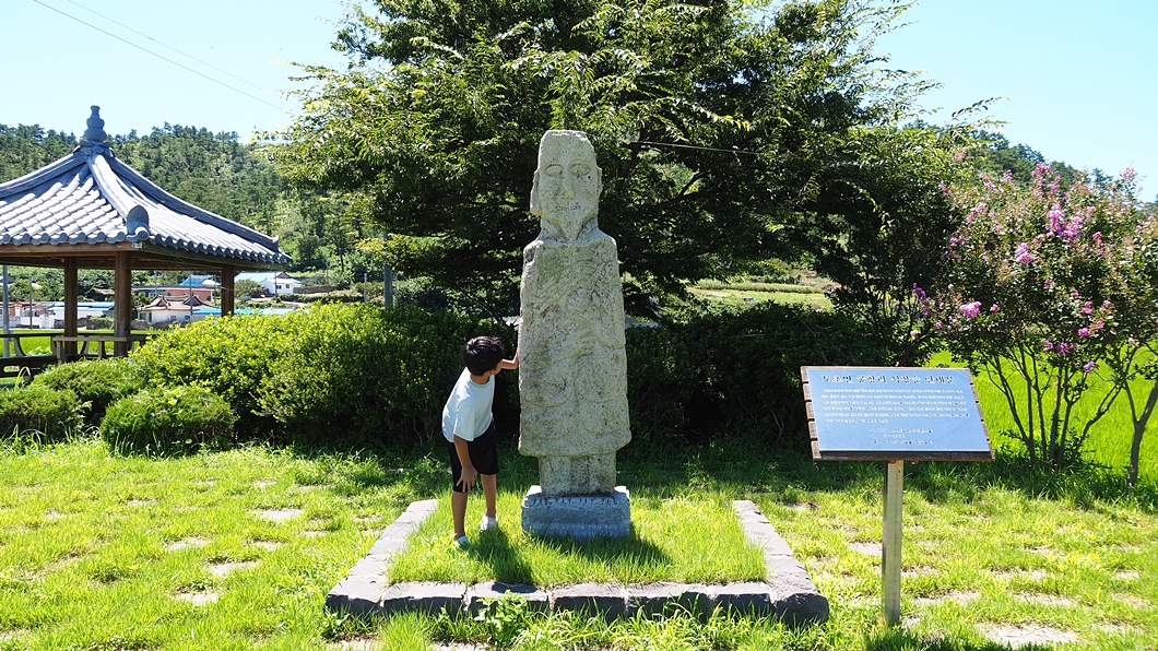 지율 군 기념사진 찍자고 했는데 장승 앞을 봅니다.