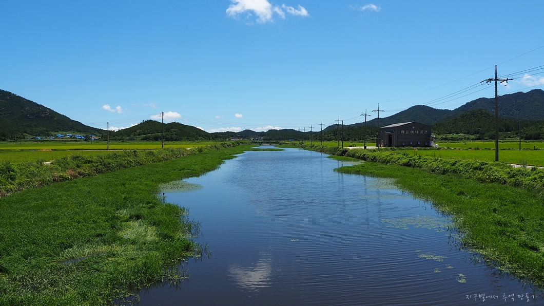 논 사이에는 수로가 있는데 모두 물이 고여 있습니다.