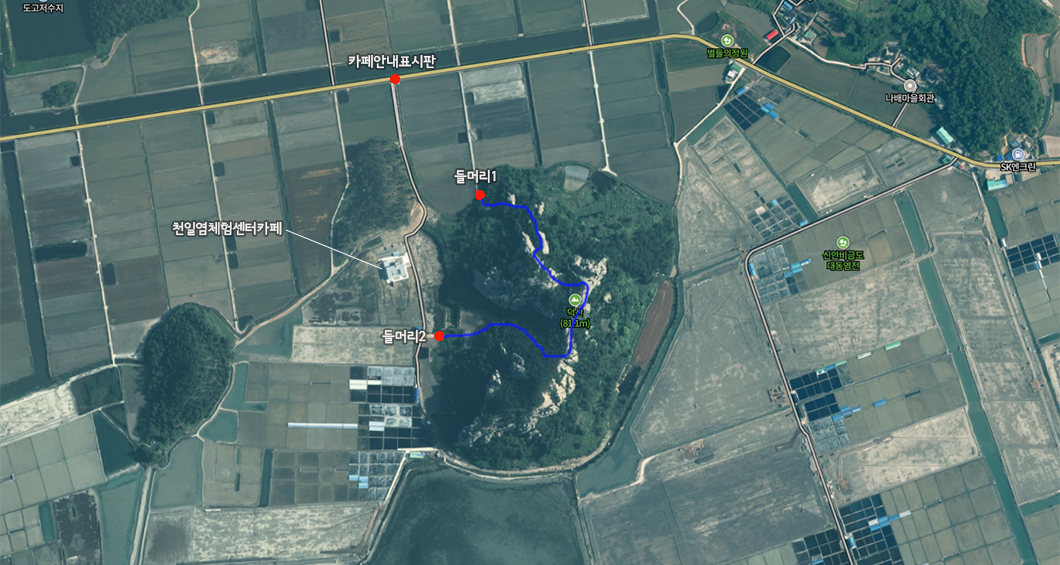 아래로 내려다보이는 깔끔한 건물이 천일염체험카페건물입니다.