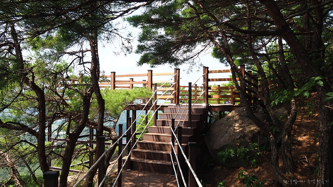 나각산에서 가장 가파른 구간인 이 계단만 오르면 출렁다리와 팔각정자인 낙강정.