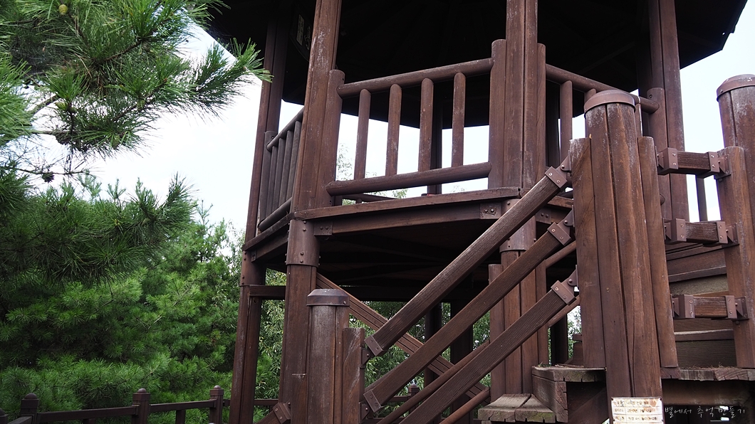 이층 정자에 올라서 점심 식사를 하려고 했는데 집이 기우뚱하다는 생각이 드니 오래 있을 기분이 나지 않네요.