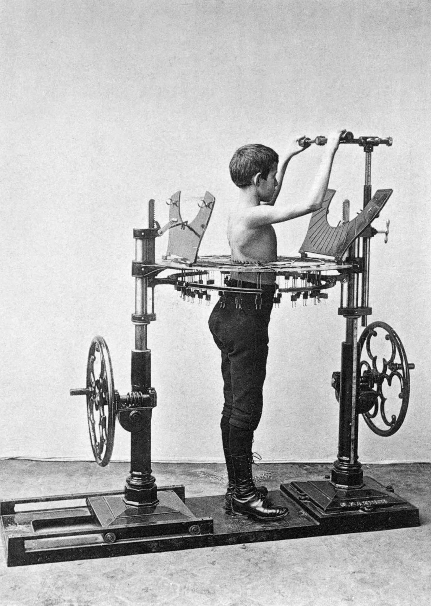 고문기구처럼 보이는 이 장치는 흉곽을 바로 잡는 기구