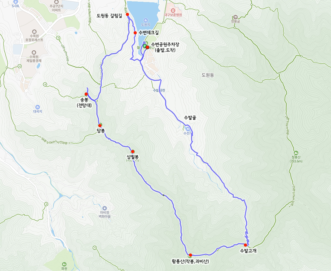 산행 코스 : 월광수변공원 주차장 - 수밭골 - 수밭고개 - 황룡산(작봉, 과기산) - 삼필봉 - 담봉 - 송봉 전망대 - 수변데크길 - 주차장(원점회귀)